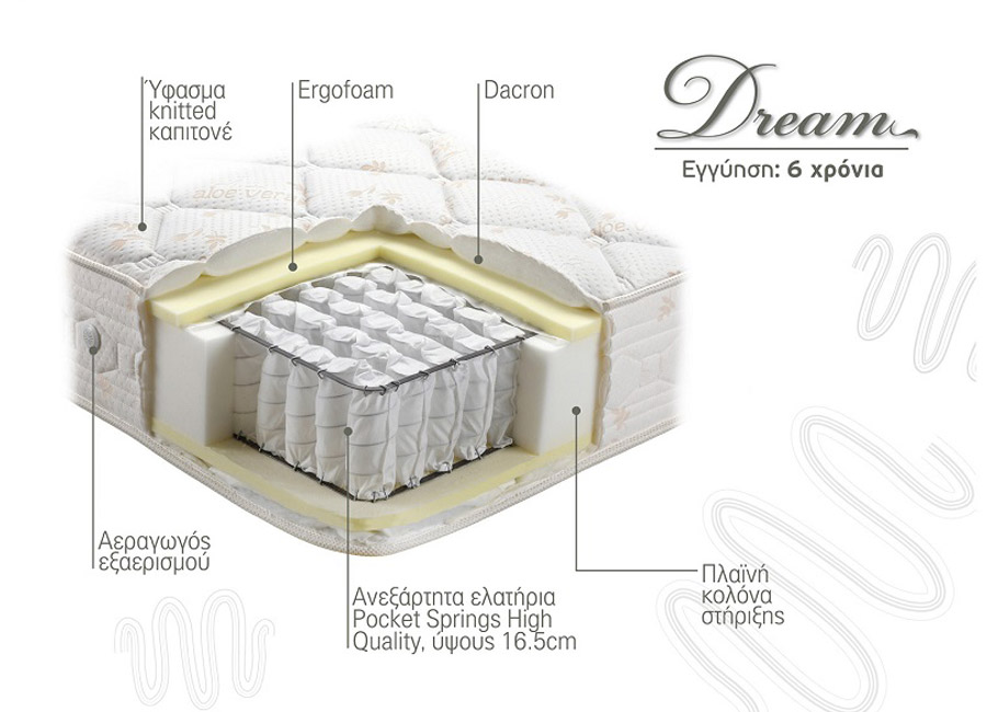 Το εύκαμπτο υλικό, εργονομικού χαρακτήρα Ergofoam και τα ανεξάρτητα ελατήρια Pocket Springs High Quality συνεργάζονται μοναδικά, στηρίζουν την σπονδυλική σας στήλη και την διατηρούν στη φυσική της κλίση. Για «ονειρεμένα» όνειρα επιλέξτε Dream!