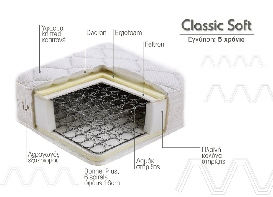 Κατασκευασμένο από το συνδυασμό των υλικών Feltron και το αφρώδες υλικό Ergofoam. Χρησιμοποιεί τα κλασικού τύπου ελατήρια Bonnel Plus και προσφέρει ποιότητα και σωστή ορθοπεδική στήριξη. Βρείτε στο στρώμα Classic Soft μία κλασική πρόταση με διαχρονική αξία σε προσιτή τιμή.