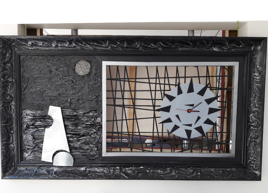 Καταπληκτικός πίνακας σε μαύρο & ασημί τοποθετημένος σε ξύλινη εντυπωσιακή κορνίζα. Συνδυάζει με μοναδικό τρόπο μέταλλο, ξύλο βαμμένο με τεχνοτροπία και κορδόνι επάνω στο οποίο είναι τοποθετημένο ρολόι.