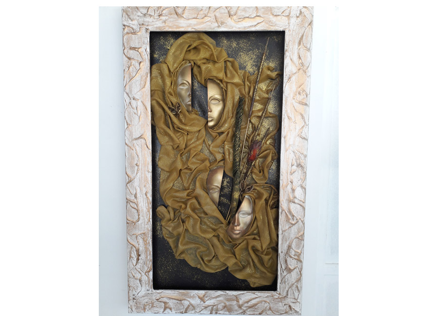 Περίτεχνο δημιούργημα πάνω σε ξύλο χρώματος μάυρου που απεικονίζει πρόσωπα σε χρώμα χρυσού πάνω σε ύφασμα χρυσό λουσμένο με χρυσόσκονη. Εξωτερικά περιβάλλεται από μασίφ ξύλινη κορνίζα σε τεχνοτροπία χρώματος μπεζ και χρυσό.