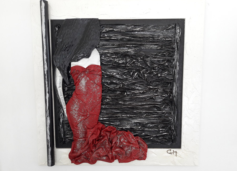 Πρωτότυπη καλλιτεχνική δημιουργία του NIKOLAS που απεικονίζει γυναίκα ντυμένη στα κόκκινα. Ένα έργο επάνω σε ξύλο με περίτεχνη κορνίζα σε τεχνοτροπία περιμετρικά και μεταλλικές λεπτομέρειες.