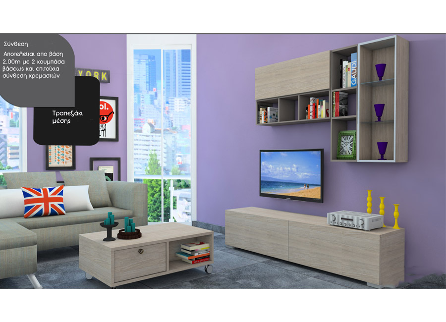Ένα από τα έπιπλα που διακοσμούν τον χώρο ενός σαλονιού είναι σχεδόν πάντα μία σύνθεση ή ένα σύνθετο. Με αποθηκευτικούς βοηθητικούς χώρους δημιουργούν μία ανάλαφρη αίσθηση και νότα. Παρουσιάζουμε μία εξαιρετική σύνθεση η οποία αποτελείται απο μία βάση 2,00 μέτρα με 2 κουμπάσα βάσεως και επιτοίχια σύνθεση κρεμαστών. Κατασκευάζεται σε πολλούς χρωματισμούς από το σε μεγάλη ποικιλία χρωμάτων δειγματολόγιό μας.