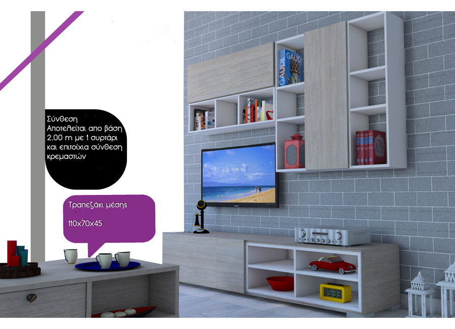 Ένα καθιστικό σχεδόν πάντα παίρνει ποιοτική νότα με την παρουσία μιας κομψής και μοντέρνας σύνθεσης που βοηθά τόσο στην αποθήκευση, όσο και στην καλυτέρευση της αισθητικής του χώρου. Μπορείτε να επιλέξετε τη σύνθεση που εσείς επιθυμείτε και ανταποκρίνεται στις ανάγκες σας σε πολλούς χρωματικούς συνδυασμούς. Σας παρουσιάζουμε μία σύνθεση που αποτελείται από μία βάση 2,00 μέτρα με 1 συρτάρι & επιτοίχια σύνθεση κρεμαστών.