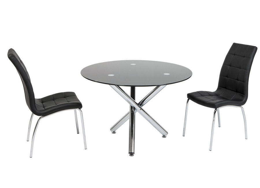 Τραπεζαρίες κουζίνας ή σαλονιού σε πολύ χαμηλές τιμές και ποιότητα κατασκευής. Τραπεζαρία μοναδικής σχεδίασης ειδικότερα στην βάση του τραπεζιού με τα χιαστί νίκελ πόδια αλλά και την καρέκλα με τα εξώραφα γαζιά σε κάθισμα και πλάτη. Τραπέζι νίκελ με κρύσταλλο και καρέκλες με νίκελ και δερματίνη (χρώμα κρυστάλλου τραπεζιού: διαφάνεια, μαύρο & χρώμα δερματίνης καρέκλας: μαύρο, λευκό, καφέ, εκρού, μόκα, γκρι).