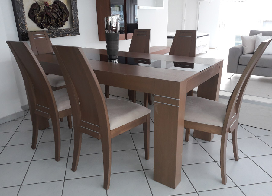Ένα διαχρονικό σετ τραπεζαρίας για τον χώρο στον οποίο περνάτε με την οικογένειά σας και υποδέχεστε τους φίλους σας. Οι μεταλλικές λεπτομέρειες στα πόδια του τραπεζιού και το κρύσταλλο κάνουν αυτο το σετ μοναδικό από αισθητικής άποψης. Κατασκευάζεται σε οξυά ή δρυς ή καρυδιά ή χρώμα λάκας κατόπιν παραγγελίας. Αναλυτικα τιμές: