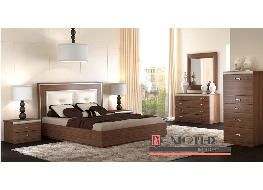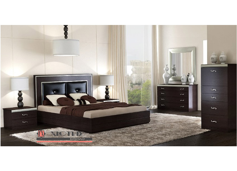 Ένα πολύ εντυπωσιακό έπιπλο κρεβατοκάμαρας που ανήκει στο μοντέρνο στυλ σχεδιασμού των δωματίων. Με ξεχωριστό φινίρισμα και χαρακτηριστικές λεπτομέρειες που ενθουσιάζουν, η σύνθεση αυτής της κρεβατοκάμαρας είναι ιδανική για χώρους με άποψη και στυλ. Η εξαιρετική ποιότητα κατασκευής συνδέεται με το απόλυτο και επιβλητικό design στο σετ αυτό, δημιουργώντας ένα φανταστικό σύνολο. Η κρεβατοκάμαρα στο κεφαλάρι του κρεβατιού ντύνεται με ύφασμα ή δερματίνη επιλογής σας και παράγεται σε χρώμα βέγκε ή καρυδιά με δυνατότητα διχρωμίας με λάκα. Περιλαμβάνει: κρεβάτι (για στρώμα 160 Χ 200), 2 κομοδίνα, τουαλέτα και καθρέπτη. Παράγεται επίσης και συρταριέρα ή καθρέφτης δαπέδου με εξτρά χρέωση.