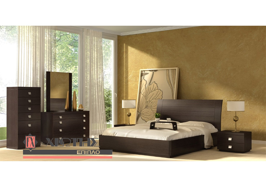 Μία πολύ μοντέρνα άποψη στις κρεβατοκάμαρες αποτελεί το συγκεκριμένο μοντέλο. Παράγεται σε ξύλο wenge ή καρυδιά ενώ υπάρχει η δυνατότητα να συνδυαστεί με όλα τα χρώματα λάκας. Το κεφαλάρι του κρεβατιού ντύνεται με ύφασμα ή δερματίνη επιλογής σας από τα δειγματολόγια μας ή κατασκευάζεται επίσης και με ξύλο εξ' ολοκλήρου με σχέδιο σκωτίες που τονίζουν ιδιαίτερα. Το κρεβάτι με την προσθήκη ειδικού μηχανισμού, μετατρέπεται εύκολα σε χρήσιμο αποθηκευτικό χώρο. Περιλαμβάνει: κρεβάτι (για στρώμα 160 Χ 200), 2 κομοδίνα, τουαλέτα και καθρέπτη. Παράγεται επίσηςκαι συρταριέρα ή καθρέφτης δαπέδου με έξτρα χρέωση.